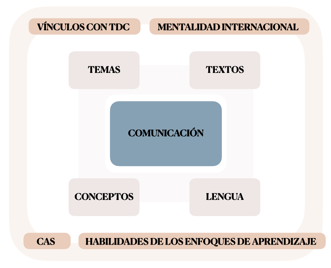 El programa de estudios de Lengua B gira entorno a la comunicación en español, que se organiza en destrezas receptivas, productivas y de interacción. Los elementos clave para desarrollar las habilidades comunicativas de los estudiantes son la lengua, las cinco áreas temáticas en que se estructura el curso (los temas), los textos y los conceptos. Por último, el curso está en todo momento relacionado con los elementos clave del Programa del Diploma (PD): con el objetivo de comunicarse en la lengua objeto de estudio, se trabajarán las habilidades de enfoque del aprendizaje, se relacionarán con las tareas y conceptos de Creatividad, Actividad y Servicio (CAS) y con la mentalidad internacional, y se establecerán vínculos con Teoría del Conocimiento (TdC).