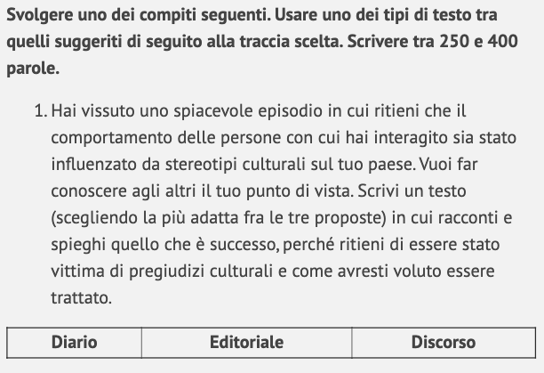 l giorno dell’ esame valuta con attenzione le tre tipologie di testo suggerite per ciascuna traccia: qual è la più adatta? Su quale ti senti più sicuro?  Anche per l’ argomento, non scegliere solo quello che ti piace di più ma valuta se hai sufficienti argomentazioni da presentare e sei conosci bene il vocabolario tematico.