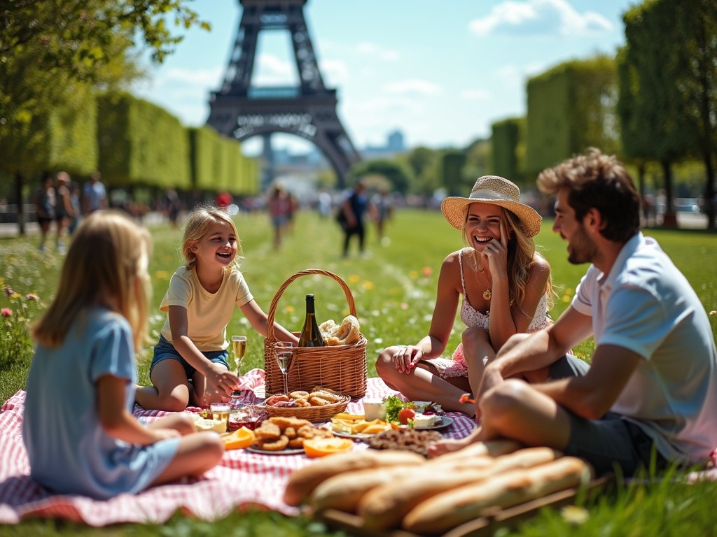 L'image montre une scène de pique-nique dans un parc à Paris, avec la Tour Eiffel en arrière-plan. Un couple est assis sur une couverture, souriant et heureux. Ils ont un panier de pique-nique devant eux, rempli de pains et de pâtisseries.