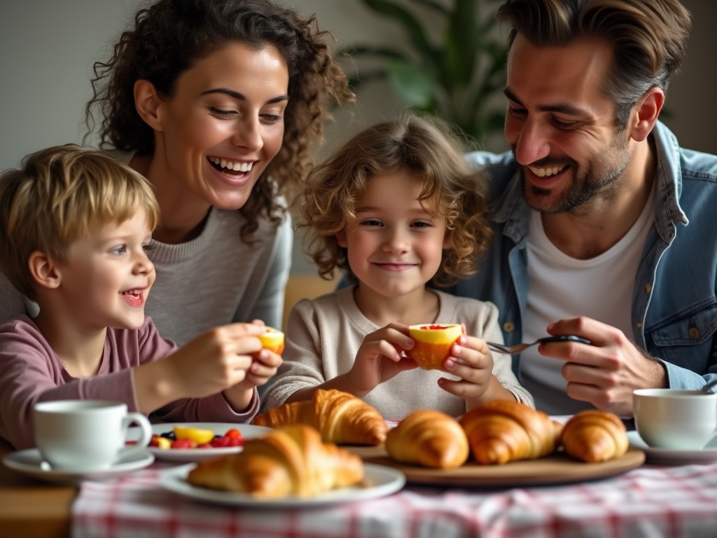 L'image montre une joyeuse famille réunie autour d'une table pour le petit-déjeuner. La mère et le père sourient, entourés de deux enfants, un garçon et une petite fille. Tous semblent heureux.