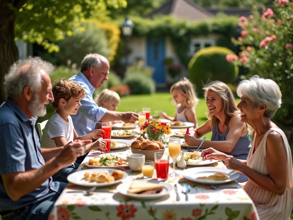 L'image montre une belle réunion familiale autour d'une table en plein air. La table est bien dressée avec des assiettes, des verres et différents plats de nourriture. On voit du pain, des salades et des jus de fruits.