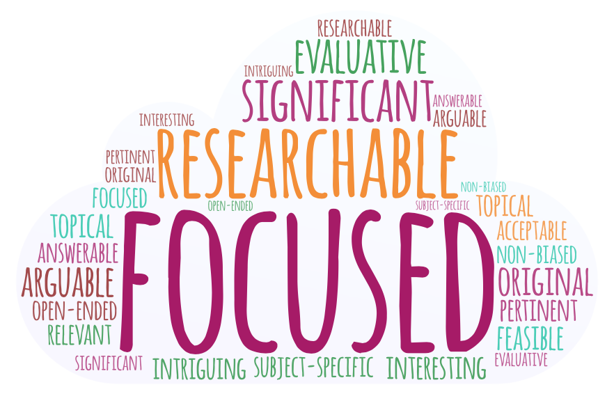 Have you made a list of characteristics of a good research question? Which characteristics are most important? Compare your list of characteristics with those that appear in the word cloud below? Click on the cloud to make it appear larger in a new window. Responsive image