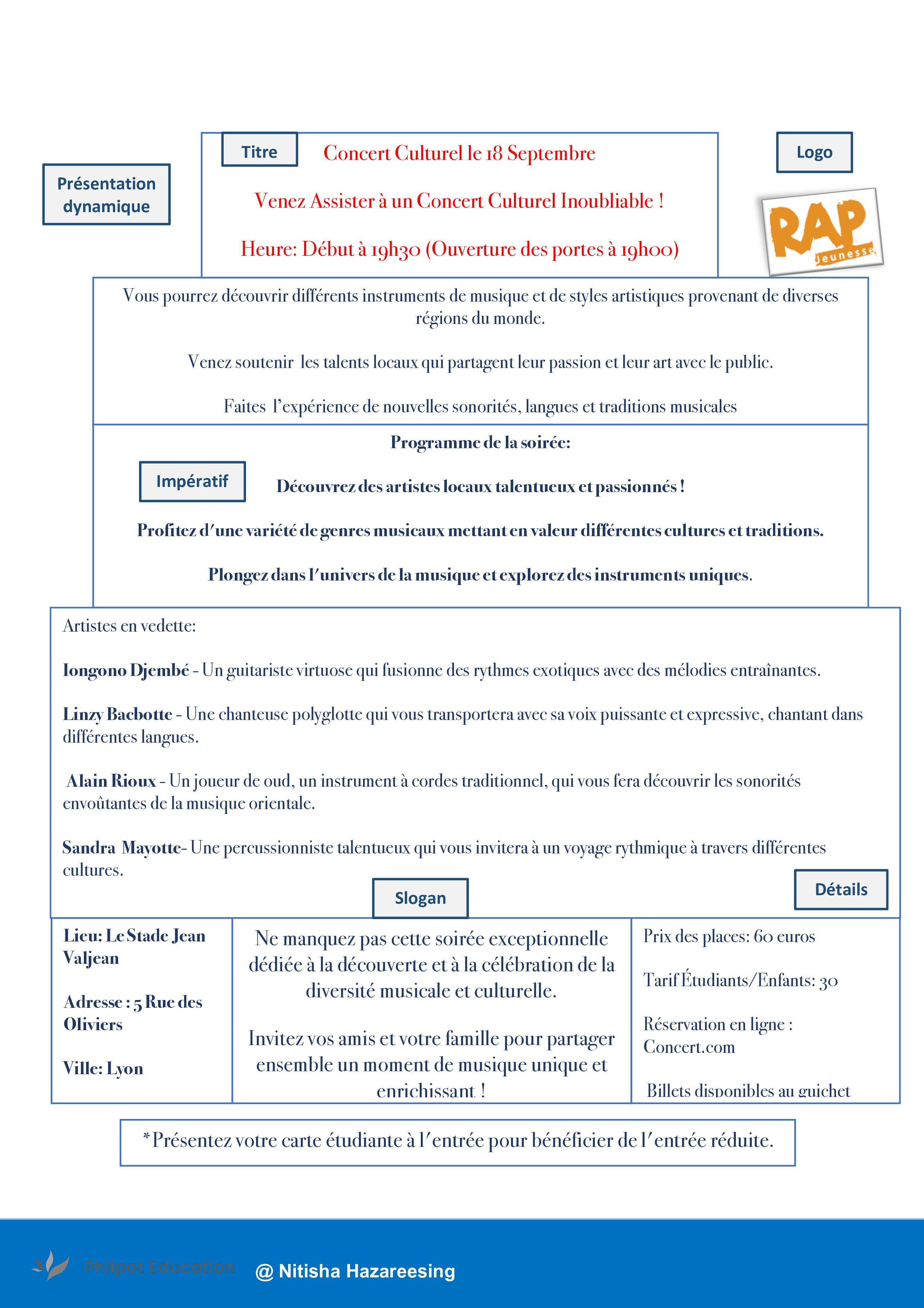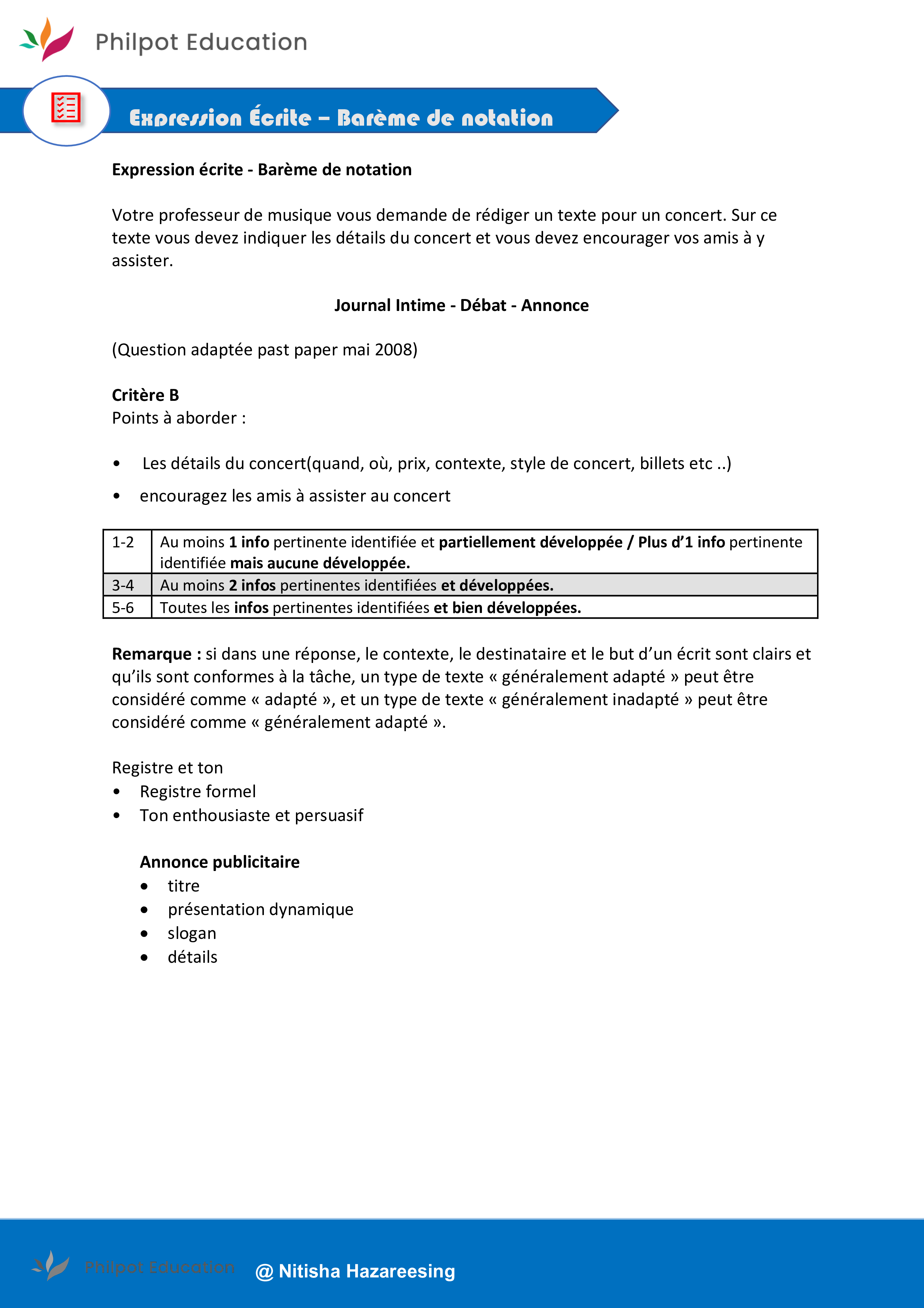 Votre professeur de musique vous demande de rédiger un texte pour un concert. Sur ce texte vous devez indiquer les détails du concert et vous devez encourager vos amis à y assister.(adapté mai 2008)