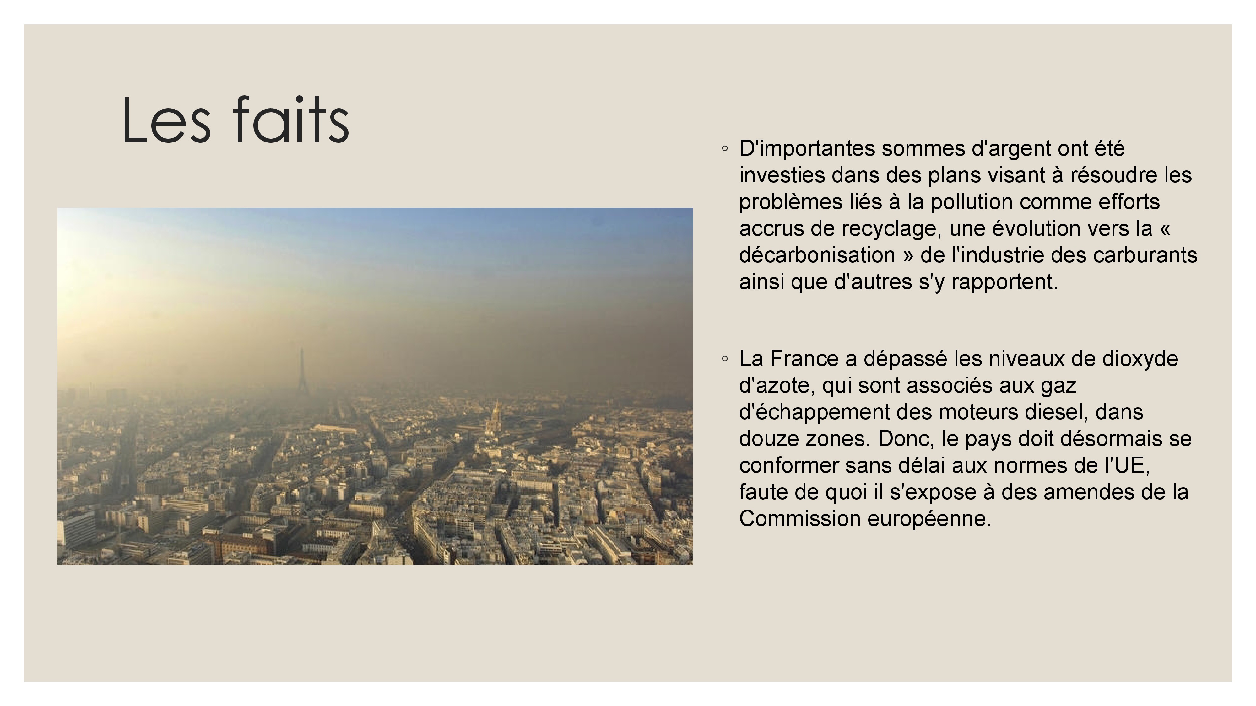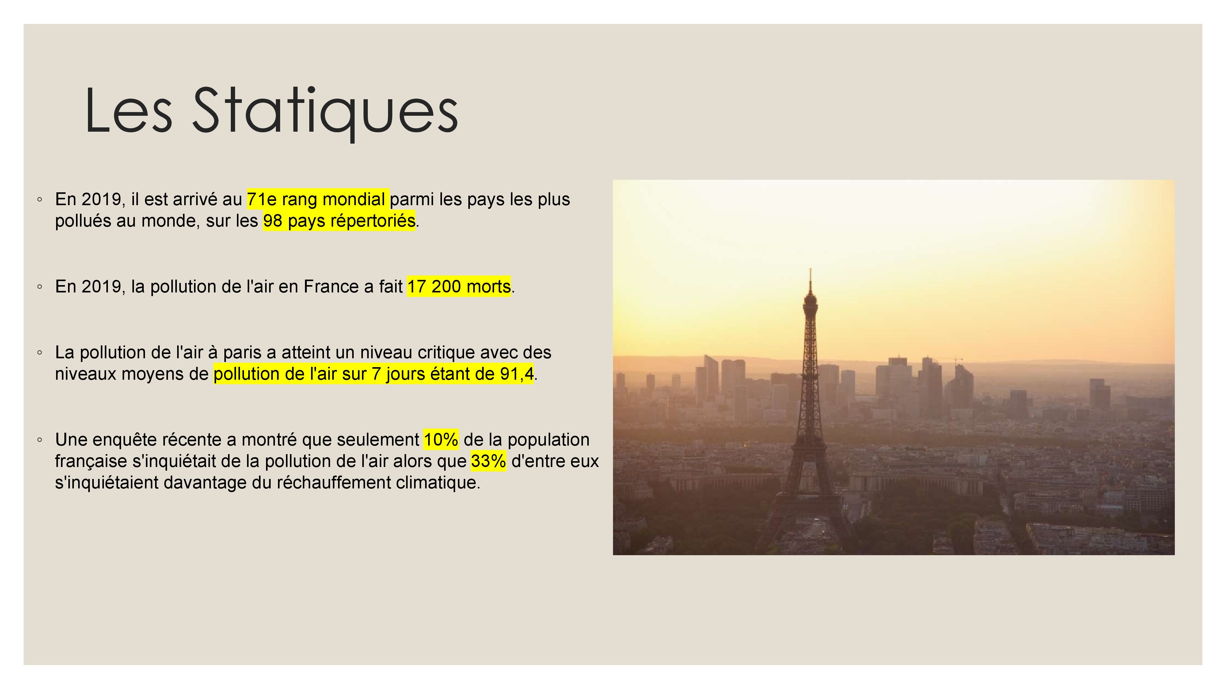 La pollution de l'air : C'est la présence de substances nocives dans l'atmosphère, comme les gaz d'échappement des véhicules, les émissions industrielles et les particules fines. Elle peut affecter la qualité de l'air que nous respirons.